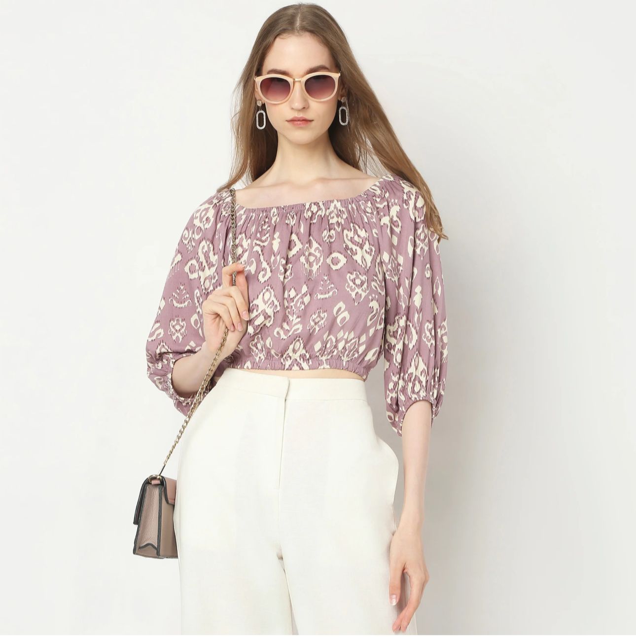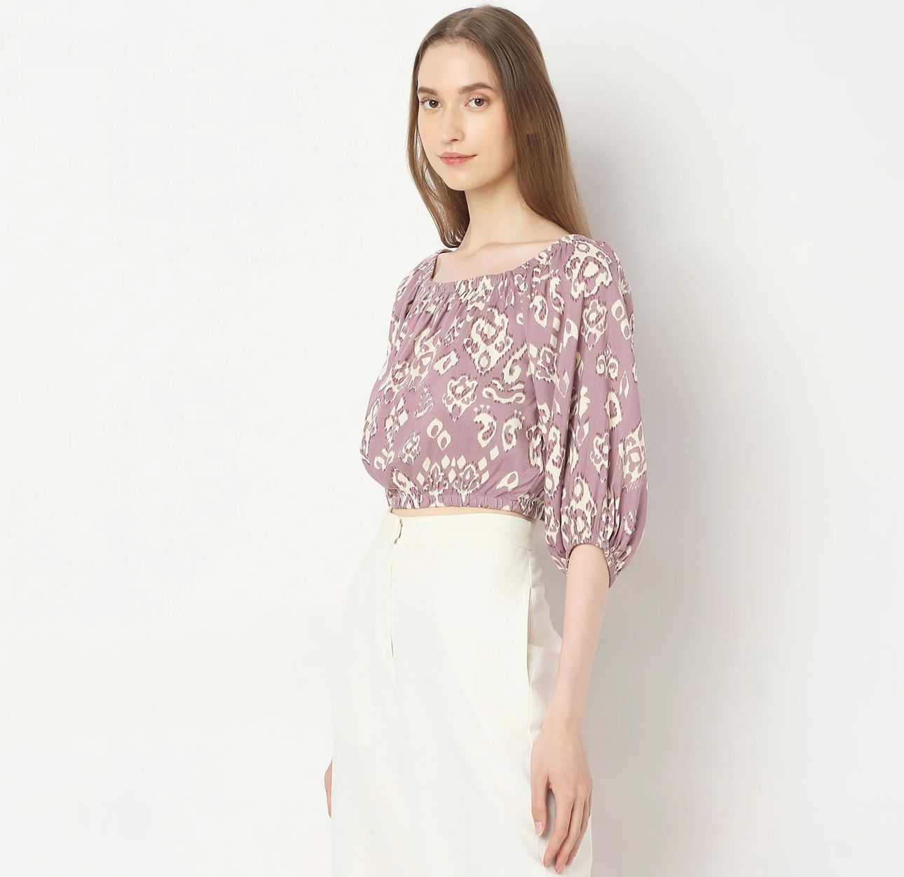 This printed pattern crop top has a camp collar and three-fourth sleeve. Made from rayon, it is soft and comfortable to wear.